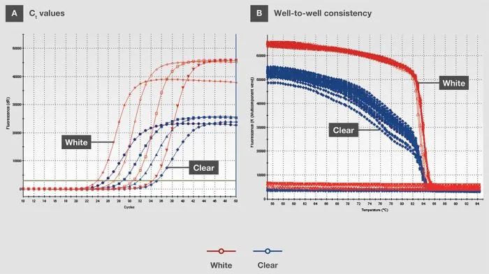 白色耗材通過阻止熒光折射出管(圖2A)來提高qPCR數據的靈敏度和一致性。折射被最小化時,更多的信號被反射回檢測器,從而增加信噪比(圖2B)。此外,白色管壁可阻止熒光信號傳遞至PCR儀模塊,避免被吸收或不一致地反射熒光信號,從而使重復實驗(圖1B)中的差異降至最低。在極少數情況下,如果熒光探測器由于白色孔的信號反射增強而過飽和,可以使用磨砂孔替代。