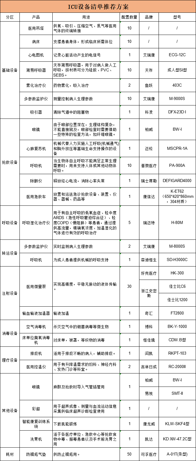國家推進重癥設備配置,ICU設備備受重視,各地在推進過程中政策支持與補助力度顯著加強,有關設備清單已整理??????